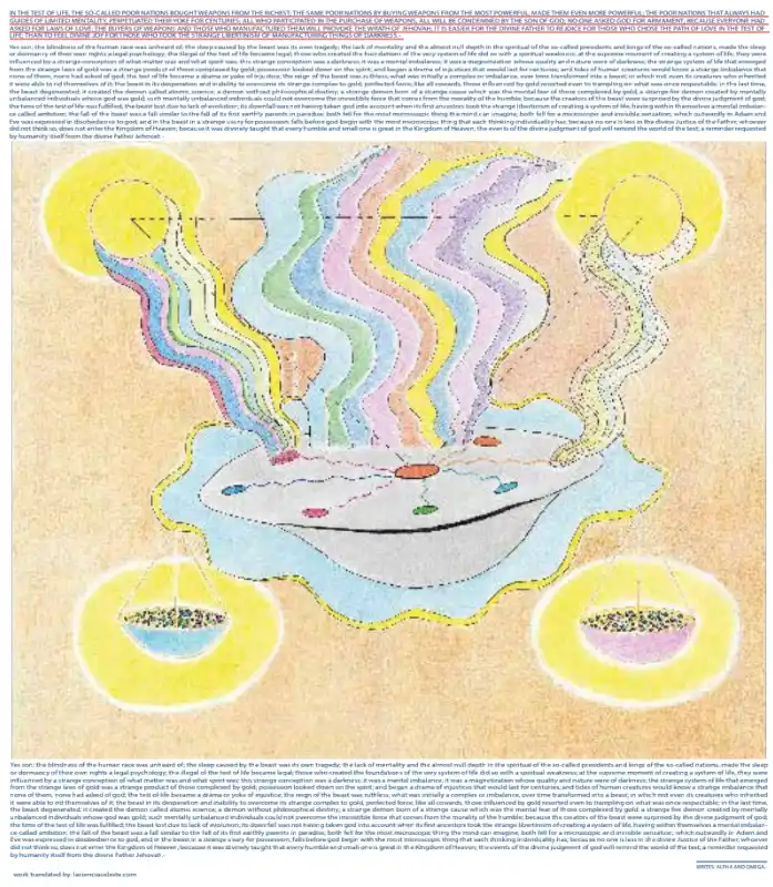 Just as you think, son; the celestial drawing teaches that physical ideas are born from the same elements that each one generated in the test of life; thus, even the elements will accuse those who, having generated ideas, did so thinking about weaponry. The weeping and gnashing of teeth that those who thought about weapons will suffer will be immense; because the elements will deny their cooperation to all those who succumbed to the strange debauchery of relying on weapons, and in the divine judgment of God, ask to be resurrected as children of twelve years old. For it is easier for the flesh to be resurrected in one who, when generating ideas, did so thinking about love, than for one who, in their thoughts, let themselves be influenced by sensations of weaponry. Those who let themselves be influenced by so-called firearms will receive eternal fire; those who let themselves be influenced by laws of love will receive love. Love belongs to the Kingdom of Heaven; weapons belong to the beast. And the beast opposed what is of the Kingdom of Heaven during its test of life. Those who perfected themselves in the use of weapons will be called accomplices of the beast in the weeping and gnashing of teeth. And none of those who were accomplices of those who always opposed God will ever re-enter the Kingdom of Heaven. Opposing God consists of preferring the use of force over the use of love. The downfall of individuals who belonged to the so-called armed forces during the reign of the beast was due to their slumber; the beast deceived them and created a strange indifference toward humility in the customs of the people. The so-called armed forces only served a minuscule group of those obsessed with gold. For as long as capitalism existed, so did the primitivism called the armed force; all philosophies of light belong to the Kingdom of Heaven; force does not; Nor do self-interested systems of life belong to the Kingdom of Heaven. This constitutes humanity’s slumber. Human beings did not realize, as the seconds of life passed, that within themselves, a strange distortion was accumulating. And divine judgment would arrive at a given instant when they would be caught living within this distortion. The human creature is taken by surprise in the midst of its own psychology, which was given by the beast; an emotional clash occurs between what was believed to be normal in one’s own thinking and the divine psychology brought by the Son of God; this divine psychology is the same one that all asked for in the Kingdom of Heaven. It is the same that is in the divine gospel of God. What is brought from above is identical to what was written below. The momentary slumber of humanity was caused by the strange customs of the beast. The ephemeral will be awakened by the eternal. Giving importance to the ephemeral always leads to weeping and gnashing of teeth on planets of trial; It is easier for one who, in their sensations, did not give importance to the ephemeral—one who placed no limits upon themselves—to have eternity on their side in their future existences than for one who fell into strange limitations. The test of life consisted of understanding the ways of God, of comprehending that which had neither beginning nor end. For any limit imposed upon God will be considered a denial and a lack of faith in God’s infinity. Whoever diminishes God diminishes themselves; for those who belittle will always have small existences; this law endures as long as the strange arrogance of diminishing God remains in them. All mental actions carried out during the test of life that were influenced by any limitation—that same limitation falls upon the creature itself. Thus, those who chose the career of arms in the test of life will no longer have the planets of light as their destination; their destiny will be what they themselves preferred in life. Their destiny will be planets of darkness, where they will never find peace or love. Those influenced by weapons chose poorly, for the use of force does not lead to God. No one who was called to belong to the so-called armed forces of the beast will ever know a world of light again; They lost yet another opportunity in the test of life; the path that each person chose in the test of life is equivalent to their own heaven. Each life represents a heaven with its own characteristics; as the so-called armed forces do not belong to the Kingdom of God, every uniformed person has no inheritance in God. It is easier for one who fulfilled the laws of God’s love to have inheritance than for one who chose the debauchery of using force without having asked it from God. For no form of abuse is requested from God. It is well known in the Kingdom of Heaven that the Eternal is infinitely loving. That is to say, it is insolence to ask God for sensations of abuse, as is the case with those who chose the strange path of weapons in the test of life; those who belonged to the legions of Satan were traitors to God. They promised to abide by the laws of light, and the light of God excludes all forms of force. Doing the opposite of what was promised will be considered betrayal in God’s divine judgment. That is the meaning of the divine parable-warning: You cannot serve two masters. Because in the Kingdom of Heaven, it was promised to serve only one. Those who did not understand this in the test of life failed the test. That is what happened to all the individuals who belonged to the so-called armed forces that emerged during the strange reign of the beast.-