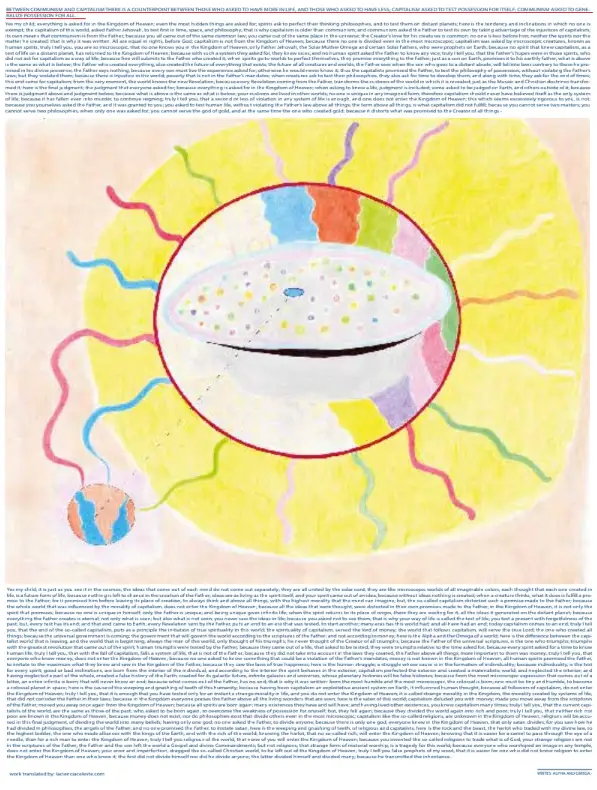 Yes my child; it is just as you see it in the cosmos; the ideas that come out of each mind do not come out separately; they are all united by the solar cord; they are like microscopic worlds of all imaginable colors; each thought that each one created in life, is a future form of life; because nothing is left to chance in the creation of the Father; ideas are as living as the spirit itself; and your spirit came out of an idea; because without ideas nothing is created; when a creature thinks, what it does is fulfill a promise to the Father; for it promised him before leaving its place of creation, to always think and above all things, with the highest morality that the mind can imagine; but, the so-called capitalism distorted such a promise made to the Father; because the whole world that was influenced by the morality of capitalism, does not enter the Kingdom of Heaven; because all the ideas that were thought, were distorted in their own promises made to the Father; in the Kingdom of Heaven, it is not only the spirit that promises; because no one is unique in himself; only the Father is unique; and being unique gives infinite life; when the spirit returns to its place of origin, there they are waiting for it, all the ideas it generated on the distant planet; because everything the Father creates is eternal; not only what is seen; but also what is not seen; you never saw the ideas in life; because you asked not to see them; that is why your way of life is called the test of life; you test a present with forgetfulness of the past; but, every test has its end; and that end came to Earth; every Revelation sent by the Father, puts an end to an era that was tested, to start another; many eras has this world had; and all have had an end; today capitalism comes to an end; truly I tell you, that the end of the so-called capitalism, puts as a principle the initiation of true spirituality in this world; the spirituality of capitalism, served the lord of money; the world that follows capitalism, will serve the true Lord; the one who created all things; because the universal government is coming; the government that will govern the world according to the scriptures of the Father; and not according to money; here is the Alpha and the Omega of a world; here is the difference between the capitalist world that is leaving, and the world that is beginning; always the man of this world, only thought of his triumphs; he never thought of the Creator of all triumphs; because the Father of the universal scriptures, is the one who triumphs; triumphs with the greatest revolution that came out of the spirit; human triumphs were tested by the Father; because they came out of a life, that asked to be tested; they were triumphs relative to the time asked for; because every spirit asked for a time to know human life; truly I tell you, that with the fall of capitalism, falls a system of life, that is not of the Father; because they did not take into account in the laws they created, the Father above all things; more important to them was money; truly I tell you, that everyone who knew money, does not enter the Kingdom of Heaven; because no one asked to know something that could be a violation of the Father’s mandates; money is not known in the Kingdom of Heaven; all human spirits promised the Father, to imitate to the maximum what they knew and saw in the Kingdom of the Father; because they saw the laws of true happiness; here is the human struggle; a struggle whose cause is in the formation of individuality; because individuality, is the test for every spirit; good or bad inclinations, are born from the interior of the individual; and according to the interior the spirit behaves in the exterior; capitalism perfected the exterior and created a materialistic world; and neglected the interior; and having neglected a part of the whole, created a false history of the Earth; created for its galactic future, infinite galaxies and universes, whose planetary histories will be false histories; because from the most microscopic expression that comes out of a letter, an entire infinite is born; that will never know an end; because what comes out of the Father, has no end; that is why it was written: from the most humble and the most microscopic, the colossal is born; one must be tiny and humble, to become a colossal planet in space; here is the cause of the weeping and gnashing of teeth of this humanity; because having been capitalism an exploitative ancient system on Earth, it influenced human thought; because all followers of capitalism, do not enter the Kingdom of Heaven; truly I tell you, that it is enough that you have tested only for an instant a strange morality in life, and you do not enter the Kingdom of Heaven; it is called strange morality in the Kingdom, the morality created by systems of life, that did not consider the Father in their laws; because in the Kingdom everyone praises the Father above all the living wonders that are seen; here is the satan of this world; capitalism deluded you with money; made you move away from the scriptures of the Father; moved you away once again from the Kingdom of Heaven; because all spirits are born again; many existences they have and will have; and having lived other existences, you knew capitalism many times; truly I tell you, that the current capitalists of the world, are the same as those of the past; who asked to be born again, to overcome the weakness of possession for oneself; but, they fell again; because they divided the world again into rich and poor; truly I tell you, that neither rich nor poor are known in the Kingdom of Heaven; because money does not exist; nor do philosophies exist that divide others even in the most microscopic; capitalism like the so-called religions, are unknown in the Kingdom of Heaven; religions will be accused in this final judgment, of dividing the world into many beliefs; having only one god; no one asked the Father, to divide anyone; becau