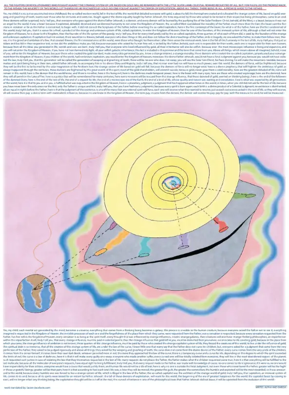 Yes, my child; each mental act generated by the mind, becomes a universe; everything that comes from a thinking being becomes a galaxy; this process is invisible to the human creature; because everyone asked the Father not to see it; everything imagined is requested in the Kingdom of Heaven; the invisible processes of each one and the forgetfulness of the place from which they came, were requested from the Father; every sensation is requested; because every sensation requested from the Father, has free will in the Kingdom of Heaven; every sensation is as living as the spirit itself; every thought that was influenced by strange influences, creates strange galaxies; their creatures will also have strange thinking philosophies; an imperfection within the imperfection itself; truly I tell you, that every strange influence, must be paid in celestial points; thus the strange influence that gold left in you, must be deducted from yourselves; no one came to life coveting gold; because in the place from which you came, the strange influence of ambition is not known; three quarters of this strange influence, must be paid by those who created the strange capitalist system of life; they forced the creatures of this world, to live under the influence of gold; this spiritual debt is so immense, that all the creators of this strange system of life, are under the law of the curse; I know little one that many say that the Father does not curse his children; but, everyone asked for a judgment that came from the very perfection of the Father; they asked to be judged rigorously and above all things; they asked for the weeping and gnashing of teeth; the curse does not come from the divine desires of the Father; every curse comes from the very pride of the children; it comes from the sinner himself; it comes from their own bad deeds; whoever persisted more in evil, the more they approached the law of the curse; there is a temporary curse and a curse for life; depending on the degree to which the spirit exceeded the limits of evil; the curse is a law of darkness; here it is that it will make every guilty one weep; everyone who made another suffer; every cursed one will live totally isolated from everyone; they will live in the most abandoned regions of the planet; such requested such justice in case of violating the law that they themselves requested in the test of life; many requests do not please the Father; the Father makes what the children requested come true; here it is that everything will be fulfilled to the last molecule; because all the molecules of everyone’s requests, have equal right to living fulfillment; truly I tell you, that every request made to the Father, was made with knowledge of cause; no one comes to life in ignorance; if it were so, no one would have responsibility for their actions; everyone would have a cause that would justify them; and human life would not be a life of trial; here is why no one is outside the Final Judgment; not even those who never loved the Father; greater will be the fright in these ungrateful beings; greater will be their pain; here it is that according to how each one’s life was, is how they will be moved; the greater the guilt, the greater the commotion; the humble and exploited will be the most rewarded; so it was announced to the world; because every humble one was forced to live a strange system of life, which is illegal in the law of the Father; the so-called capitalist was the architect of the strange world of gold; truly I tell you, that capitalism, an immoral system of life, comes to its end; because all its spirits were tested for an instant by Father Jehovah; the fall of these demons of exploitation, will mark for this world, the beginning of the era of greatest happiness for this world; the capitalist beast by ceasing to exist, will no longer infect any thinking being; the exploitative thought will be cut off at the root; this cursed inheritance is one of the philosophical trees that Father Jehovah did not leave; it will be uprooted from the evolution of this world.-