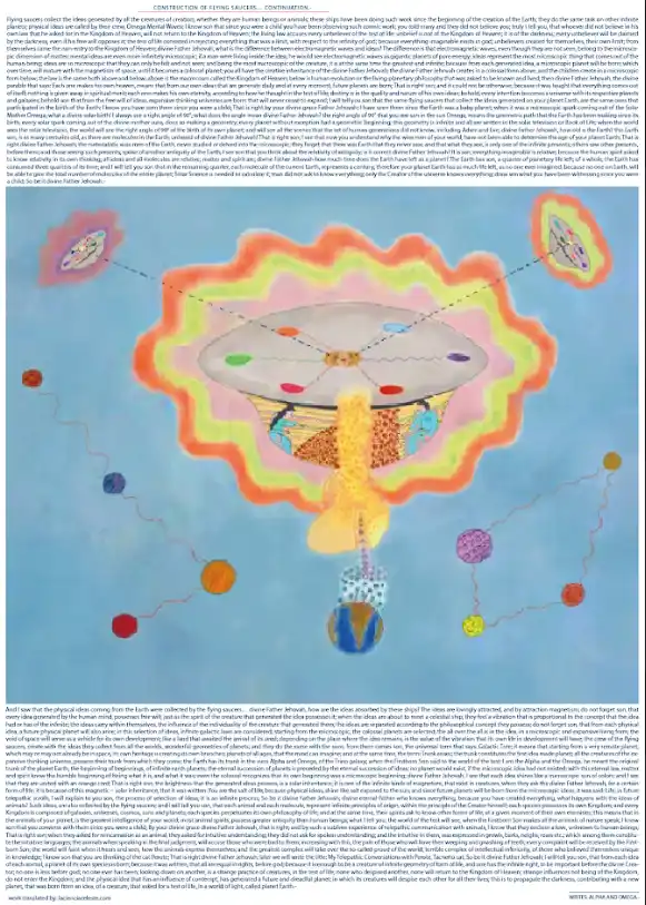 Flying saucers collect the ideas generated by all the creatures of creation; whether they are human beings or animals; these ships have been doing such work since the beginning of the creation of the Earth; they do the same task on other infinite planets; physical ideas are called by their crew, Omega Mental Waves; I know son that since you were a child you have been observing such cosmic work; you told many and they did not believe you; truly I tell you, that whoever did not believe in his own law that he asked for in the Kingdom of Heaven, will not return to the Kingdom of Heaven; the living law accuses every unbeliever of the test of life; unbelief is not of the Kingdom of Heaven; it is of the darkness; every unbeliever will be claimed by the darkness, even if his free will opposes it; the test of life consisted in rejecting everything that was a limit, with respect to the infinity of god; because everything imaginable exists in god; unbelievers created for themselves, their own limit; from themselves came the non-entry to the Kingdom of Heaven; divine Father Jehovah, what is the difference between electromagnetic waves and ideas? The difference is that electromagnetic waves, even though they are not seen, belong to the microscopic dimension of matter; mental ideas are even more infinitely microscopic; if a man were living inside the idea, he would see electromagnetic waves as gigantic planets of pure energy; ideas represent the most microscopic thing that comes out of the human being; ideas are so microscopic that they can only be felt and not seen; and being the most microscopic of the creature, it is at the same time the greatest and infinite; because from each generated idea, a microscopic planet will be born; which over time, will mature with the magnetism of space, until it becomes a colossal planet; you all have the creative inheritance of the divine Father Jehovah; the divine Father Jehovah creates in a colossal form above, and the children create in a microscopic form below; the law is the same both above and below; above is the macrocosm called the Kingdom of Heaven; below is human evolution or the living-planetary philosophy that was asked to be known and lived; then divine Father Jehovah, the divine parable that says: Each one makes his own heaven, means that from our own ideas that we generate daily and at every moment, future planets are born; That is right son; and it could not be otherwise; because it was taught that everything comes out of itself; nothing is given away in spiritual merit; each one makes his own eternity, according to how he thought in the test of life; destiny is in the quality and nature of his own ideas; behold, every intention becomes a universe with its respective planets and galaxies; behold son that from the free will of ideas, expansive thinking universes are born; that will never cease to expand; I will tell you son that the same flying saucers that collect the ideas generated on your planet Earth, are the same ones that participated in the birth of the Earth; I know you have seen them since you were a child; That is right by your divine grace Father Jehovah; I have seen them since the Earth was a baby-planet; when it was a microscopic spark coming out of the Solar Mother Omega; what a divine solar birth! I always see a right angle of 90°; what does the angle mean divine Father Jehovah? the right angle of 90° that you see son in the sun Omega, means the geometric path that the Earth has been making since its birth; every solar spark coming out of the divine mother suns, does so making a geometry; every planet without exception had a geometric beginning; this geometry is infinite and all are written in the solar television or Book of Life; when the world sees the solar television, the world will see the right angle of 90° of the birth of its own planet; and will see all the scenes that the set of human generations did not know, including Adam and Eve; divine Father Jehovah, how old is the Earth? this Earth son, is as many centuries old, as there are molecules in the Earth; unheard of divine Father Jehovah! That is right son; I see that now you understand why the wise men of your world, have not been able to determine the age of your planet Earth; That is right divine Father Jehovah; the materialistic wise men of the Earth, never studied or delved into the microscopic; they forget that there was Earth that they never saw; and that what they see, is only one of the infinite presents; others saw other presents, before them; and those seeing such presents, spoke of another antiquity of the Earth; I see son that you think about the relativity of antiquity; is it correct divine Father Jehovah? It is son; everything imaginable is relative; because the human spirit asked to know relativity in its own thinking; all ideas and all molecules are relative; matter and spirit are; divine Father Jehovah how much time does the Earth have left as a planet? The Earth has son, a quarter of planetary life left; of a whole, the Earth has consumed three quarters of its time; and I will tell you son that in the remaining quarter, each molecule of the current Earth, represents a century; therefore your planet Earth has as much life left, as no one ever imagined; because no one on Earth, will be able to give the total number of molecules of the entire planet; Solar Science is needed to calculate it; man did not ask to know everything; only the Creator of the universe knows everything; draw son what you have been witnessing since you were a child; So be it divine Father Jehovah.-