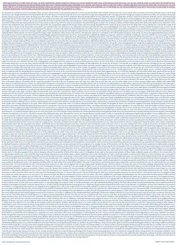 TITLE: EVERY MALNUTRITION OF EVERY BODY OF FLESH, OF EVERY GENERATION, ARISING FROM THE STRANGE LIFE SYSTEM EMERGING FROM GOLD, IS PAID MOLECULE BY MOLECULE, CELL BY CELL, ATOM BY ATOM; NO ONE ASKED THE FATHER FOR THE MALNUTRITION OF THEMSELVES; BECAUSE EVERYONE KNEW THAT SUCH STRANGE DARKNESS WAS CONTRARY TO ALL MENTAL AND PHYSICAL HEALTH; AND THAT IT WAS A STRANGE OBSTACLE TO FULFILLING GOD’S WILL IN THE TEST OF LIFE; FOR EVERY PORE OF FLESH THAT EXPERIENCED MALNUTRITION, THERE IS AN EXISTENCE THAT THOSE WHO CREATED THE STRANGE AND UNKNOWN LIFE SYSTEM BASED ON THE STRANGE POWER OF GOLD MUST LIVE OUTSIDE THE KINGDOM OF HEAVEN; THE MOST MICROSCOPIC THAT THE MIND CAN IMAGINE BECOMES LIVING BEFORE THE CREATOR OF ALL THINGS.-