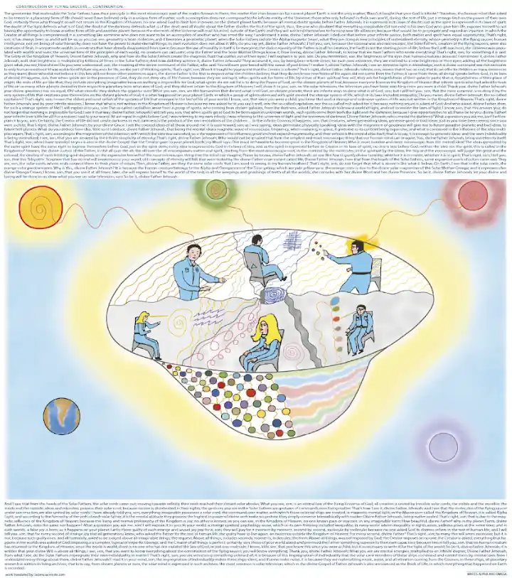 And I saw that from the heads of the Solar Fathers, the solar cords came out; moving towards infinity, their ends reached their distant solar abodes; What you see, son, is an eternal law of the living Universe of God; all creation is united by invisible solar cords; the visible and the invisible; the inside and the outside; ideas and microbes, possess their solar cord; because no one is disinherited in their rights; the gestures you see in the Solar Fathers are gestures of commands over living matter; That’s how I see it, divine Father Jehovah; and I see that the molecules of the flying saucer under construction are also united by solar cords; I have already told you, son; everything imaginable possesses a solar cord; the command over matter, with which these celestial ships are created, is magnetic-mental light; in the Macrocosm called the Kingdom of Heaven, it is called Alpha Light; and according to the hierarchy of the verb of each solar father, it is the mental attitude they possess; the highest in power of divine verb make no gesture; they simply converse telepathically with matter; Divine Father Jehovah, living matter smiles! That’s right, son; that is due to the magnetic influence of the Kingdom of Heaven; because the living and normal philosophy of the Kingdom is joy; no other is known; as you can see, in the Kingdom of Heaven, no one knows pain or injustice, in any imaginable form; How beautiful, divine Father! why in my planet Earth, divine Father Jehovah, does the same not happen? What a question you ask me, son! I will explain it to you: In your world, a strange spiritual psychology arose, which in its own thinking included inequality; in every world where inequality in rights arises, sadness arises at the same time; and in such worlds, a false joy is born; as it happens on your planet Earth; those guilty of such strange and unjust joy pay for it, son; they will pay for it moment by moment, second by second, molecule by molecule; because no one asked God to distress others in the test of human life; and I will tell you, son, that for every second of strange joy that all generations knew, who asked the Father for the test of human life, the guilty have to live again, an existence outside the Kingdom of Heaven; For every second, divine Father? That’s right, son; to many this will seem excessive; but it is not; because such guilty ones, and all humanity, asked to be judged above all imaginable things; the request: Above all things, includes seconds, moments, molecules; the term: Above all things, was not imposed by God; the Creator imposes on no one; the Creator is asked; everything that happens in the worlds was asked of God; imposing is a complex, typical of imperfect beings; and the Creator of all things is perfect; certainly, son, those of your world asked and promised the Father something superior to their own capacities; because I must tell you, son, that no human creature has returned to the Kingdom of Heaven; since the world is world; there is no one who has not violated the law of God, in just one molecule; I know, little son, that you know this since you were a child; but it is necessary to write it for the light of the world; So be it, divine Father Jehovah; it is written that your divine Will is above all things; I see, son, that you want to know everything about the construction of the flying saucer; you will know everything; Thank you, divine Father Jehovah; What you see are mental energies, multiplied to an infinite degree; Divine Father Jehovah, from what I see, do the Solar Fathers impregnate their own individuality in matter? That’s right, son; you are witnessing something unheard of; it is because of this impregnation of individuality that the solar crew members of these ships command and control them by mental laws; Now I understand many things about them, divine Father Jehovah! I read it in your mind, son; the impregnation of individuality makes these ships silent; and if some make noise, it is because they are materializing music, noise, and all vibration coming from the Cosmos; in these ships, all planetary research is written in living archives; that is to say, from distant planets or suns, the solar mind is expressed in such archives; the most common is solar television; which in the divine Gospel of Father Jehovah is also announced as the Book of Life; in which everything that happened on Earth is recorded.-